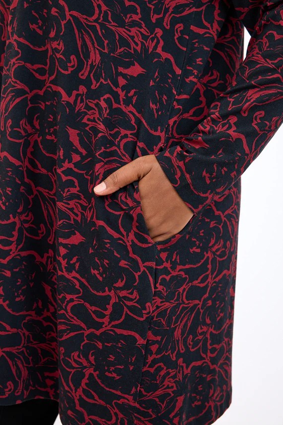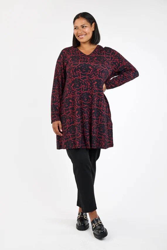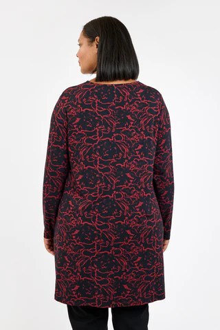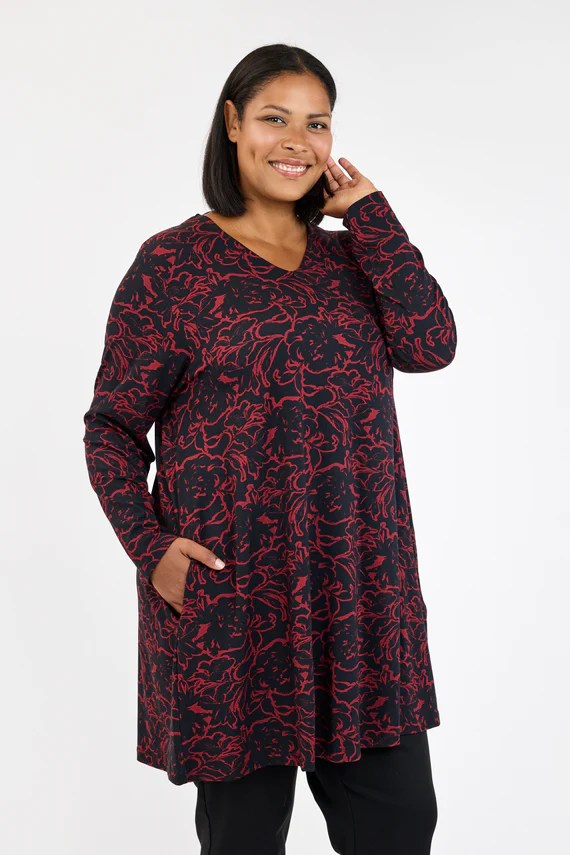 - Kuosissa mustalla pohjalla viininpunaisia kukkaa muistuttavia ääriviivakuvioita