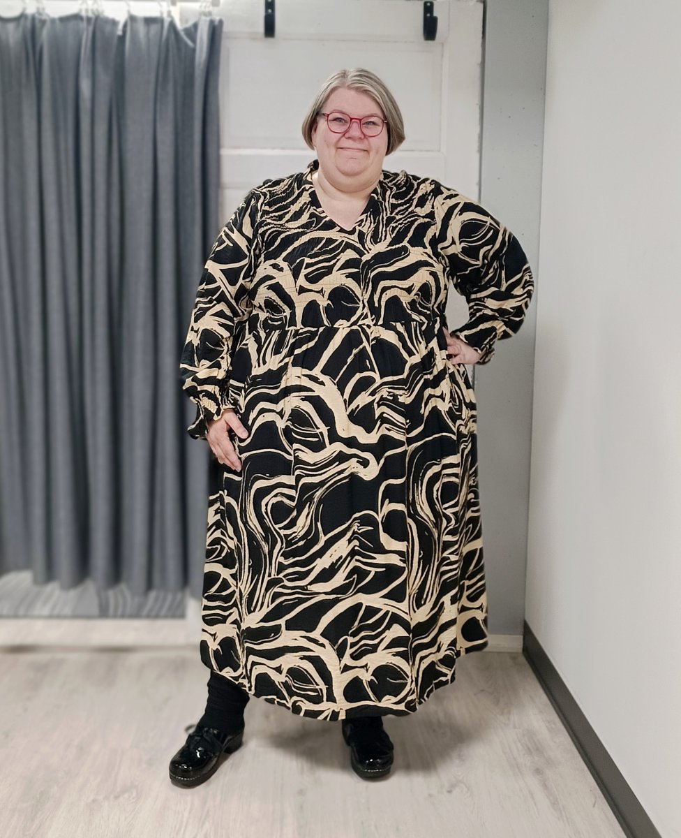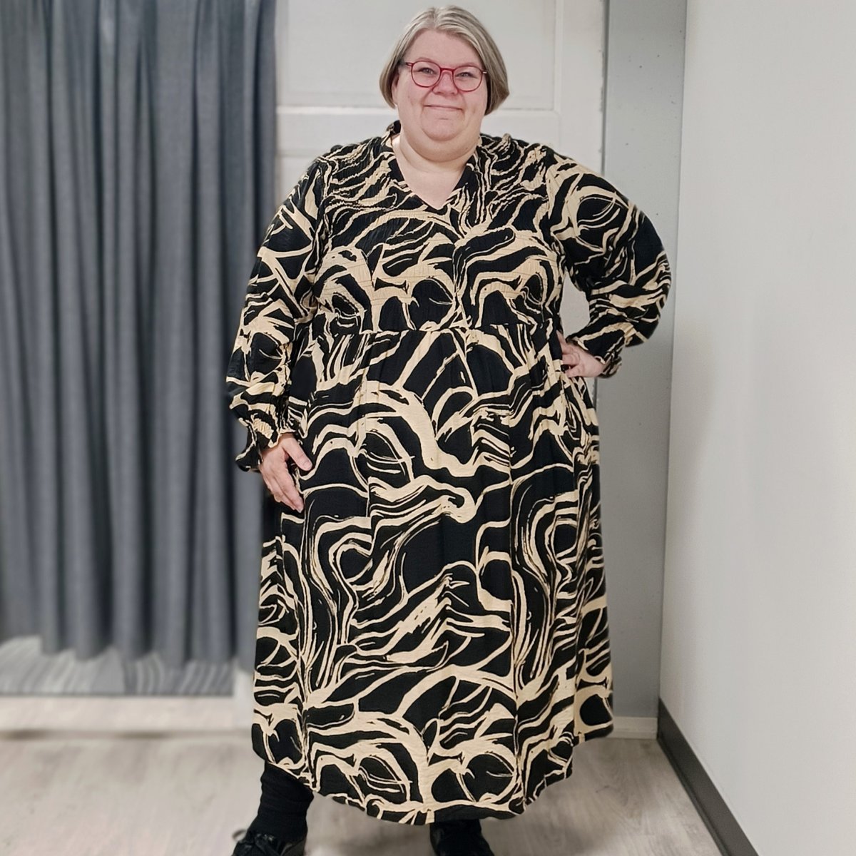 Gozzipin upea, pitkä kuviollinen viskoosimekko pluskoossa. Koot 38/40 – 54/56. Katso tuotteen oma mittataulukko sivun alareunasta!