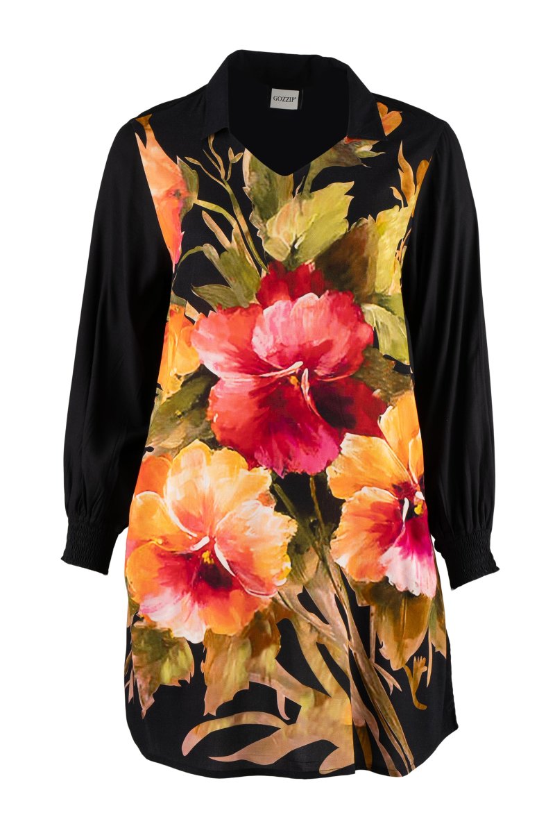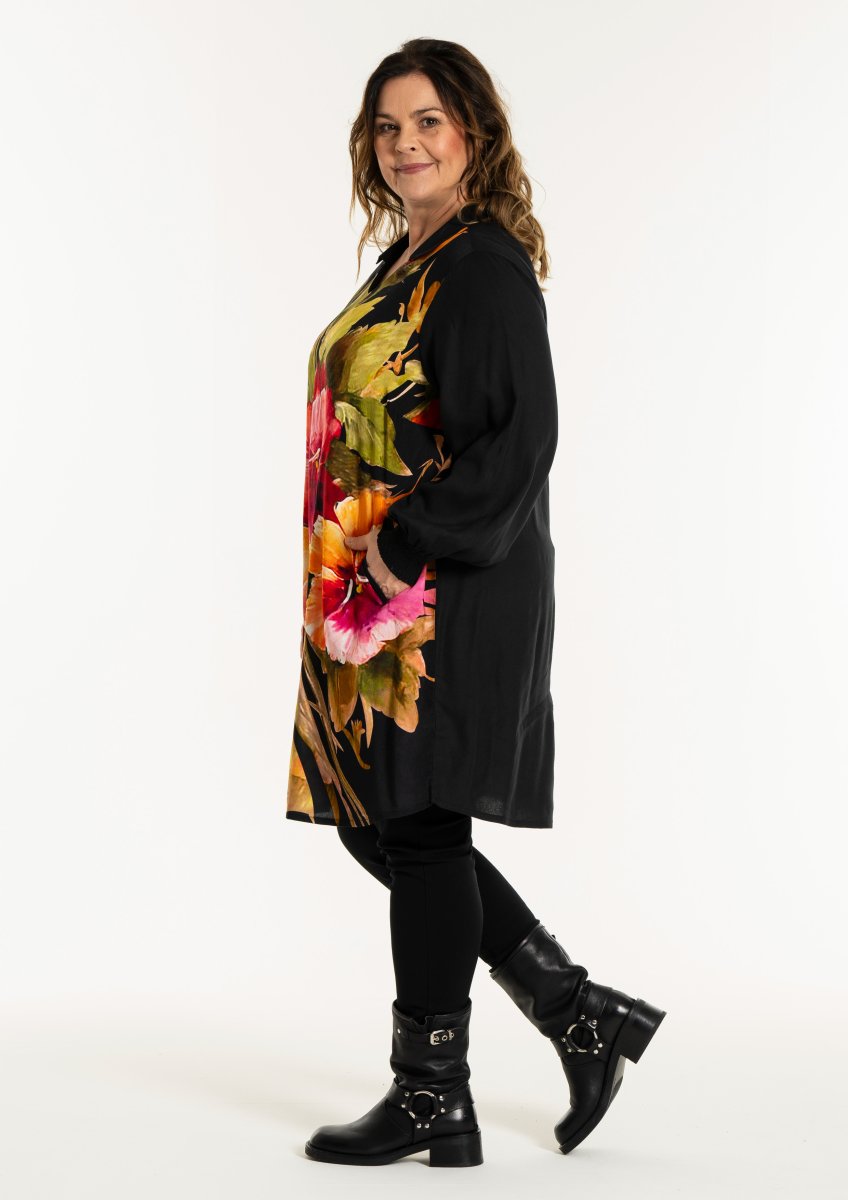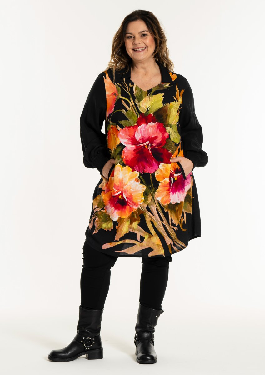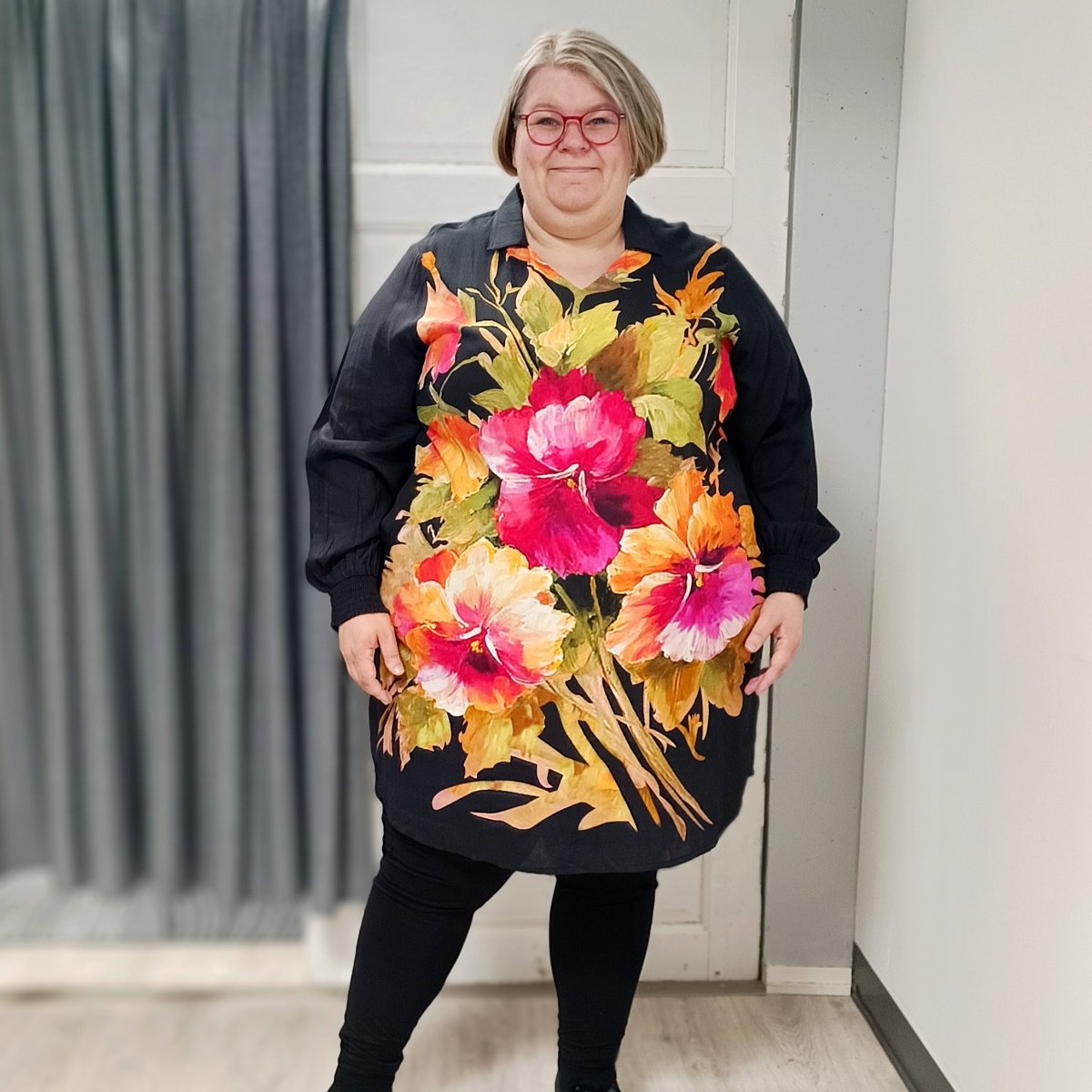 Gozzipin näyttävä ja värikäs kukkakuvioinen viskoositunikamekko pluskoossa.